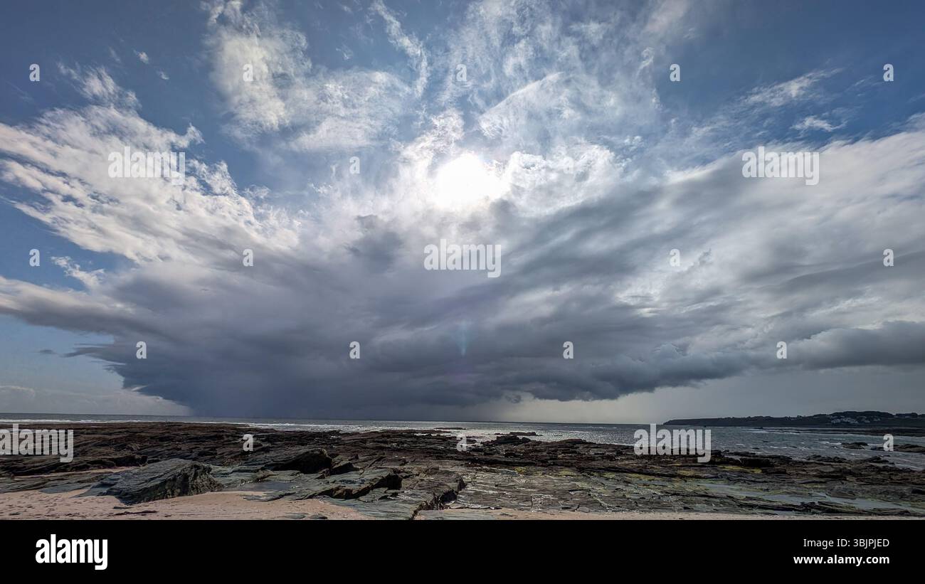 Cloud formation towers above a rocky coastline, where sunlight filters through heavy layers of gray and white, capturing the charged atmosphere before a storm. The photograph highlights the raw beauty of shifting weather patterns, blending the drama of the sky with the rugged texture of the shoreline.