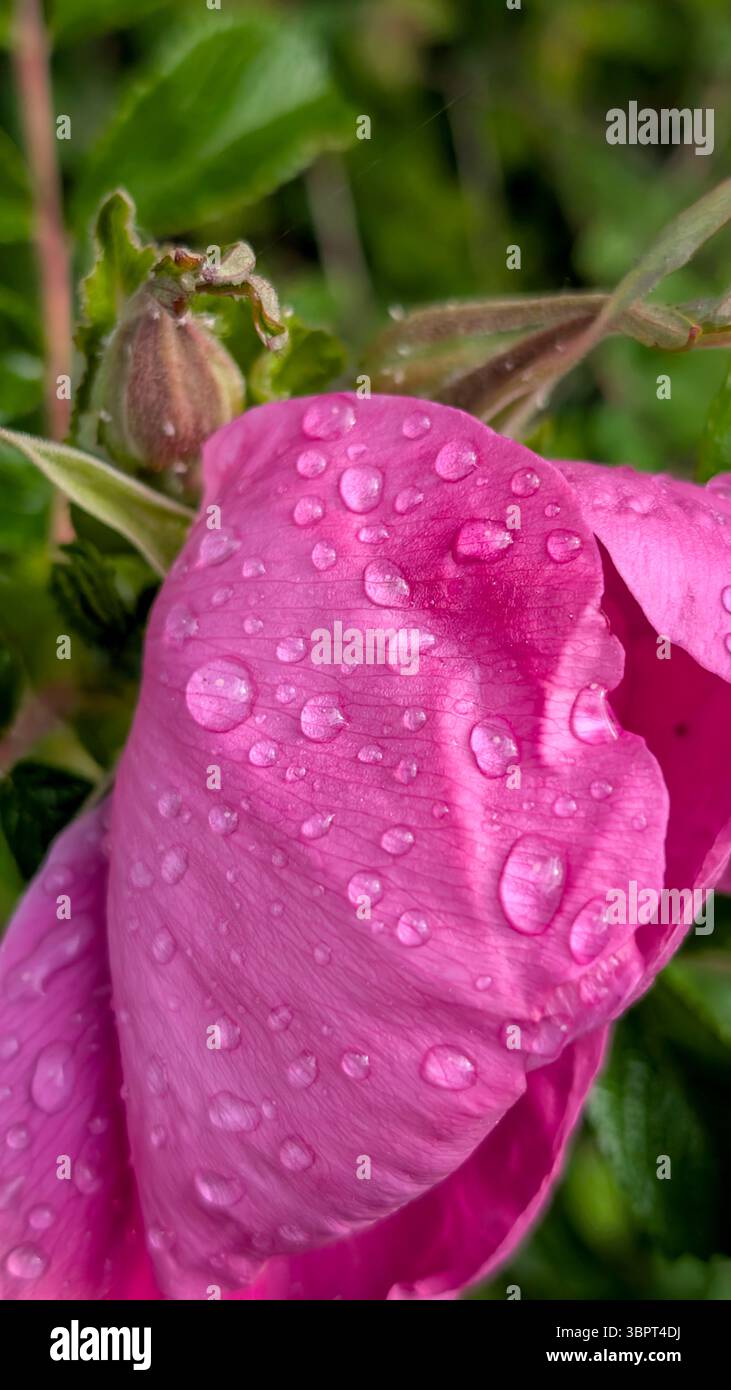 Close-up of a pink flower petal covered in raindrops after a shower, with green foliage in the blurred background.