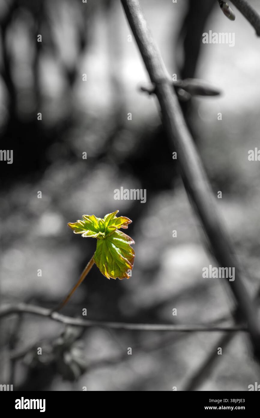 A vibrant green leaf bud on a branch stands out against a black and white background, symbolizing renewal and growth.