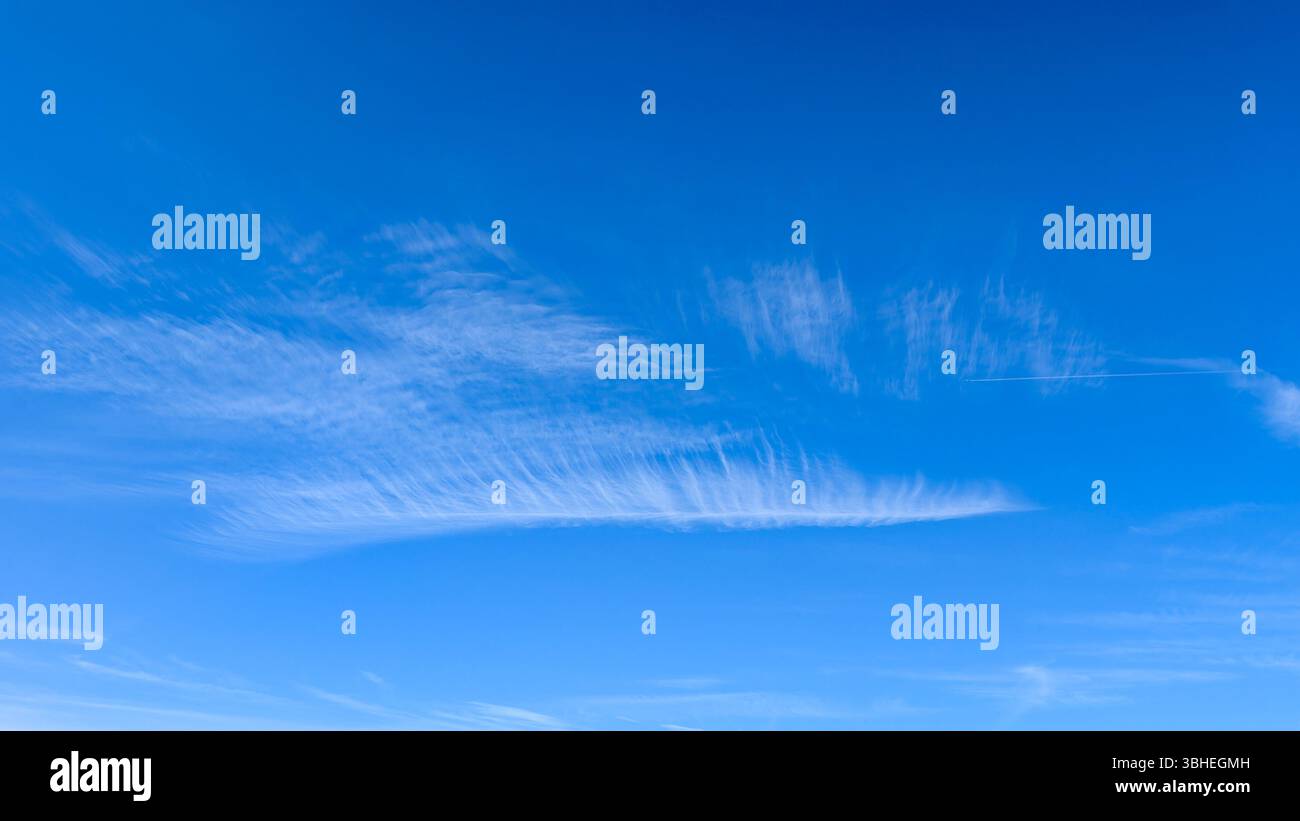 Delicate cirrus clouds drift across a vibrant blue sky, their wispy formations stretching gently above the horizon. Captured in clear daylight, the image highlights the subtle textures and patterns that cirrus clouds create as they scatter sunlight, adding softness to the sky. A faint airplane contrail appears in the distance, adding a modern touch to this natural scene.