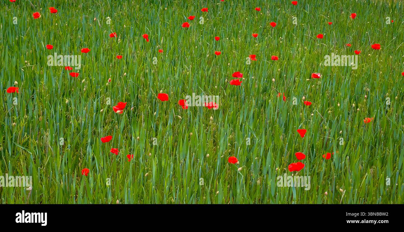 This high-resolution photograph captures a serene rural landscape where scattered red poppies bloom among golden-green wheat fields. The vivid contrast between the delicate scarlet flowers and the textured grain creates a natural pattern full of life and color. Perfect for use in editorial projects, nature-themed designs, wall art prints, or digital media, this image embodies both the beauty and resilience of wildflowers thriving in cultivated land.