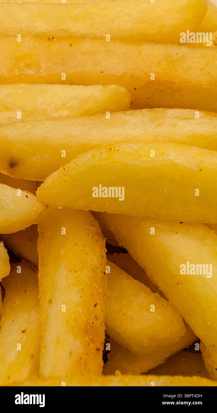 This macro photograph of freshly cooked golden French fries captures the irresistible texture and color of one of the world’s favorite comfort foods. The crisp outer layer, highlighted by specks of seasoning, contrasts with the fluffy interior, emphasizing both taste and visual appeal.