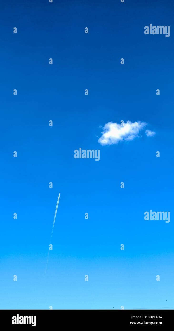 This minimalist photograph of a cloud floats in a clear blue sky captures the calm simplicity of open space above. A single fluffy cloud contrasts gently against the vivid blue, while a sharp white contrail from a jet ascends upward, adding a sense of motion and direction to the composition.